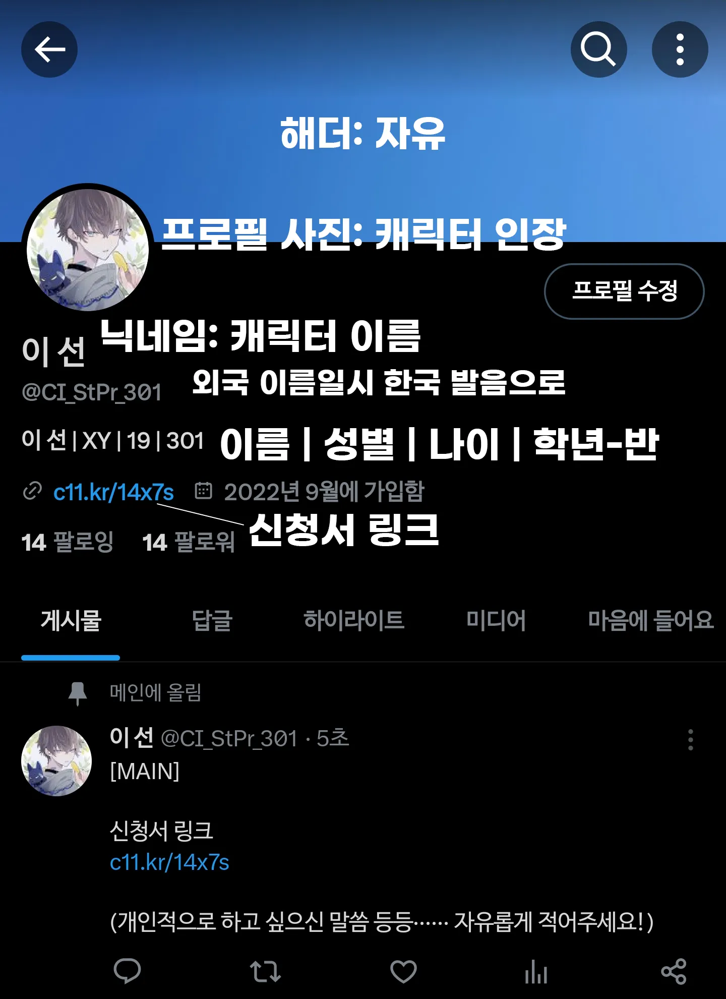 아래 트위터 계정을 캐릭터 계정으로 필수로 팔로우해주세요. 학년별 계정의 경우에도 학년 상관 없이 모든 계정을 팔로우해주세요. (계정 클릭 시 트위터로 이동됩니다.)